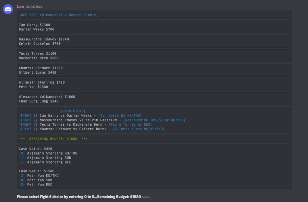 2. Each fighter has a different cost dependent on betting odds, favourites will cost more than $1000, and underdogs will cost less than $1000 – so a mix is required to stay within budget